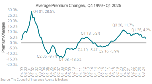 According to The Council of Insurance Agents & Brokers (CIAB) quarterly survey, commercial property/casualty premiums across all account sizes in the first quarter 2025 rose by 4.2%—down 22% from the last three months of 2024 and a “clear” signal of soft market conditions.