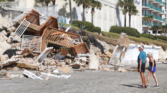 Top photo: After landfall on Florida’s southwest coast, Ian churned across the state, wrenching apart condo seawalls and hotel decks in Daytona Beach Shores. (Joe Burbank/Orlando Sentinel via AP)