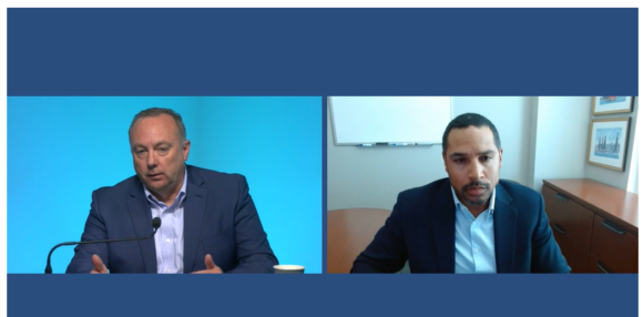 Top photo: AM Best’s Jeff Mango, left, and Guy Carpenter’s Randy Fuller, in the webinar.